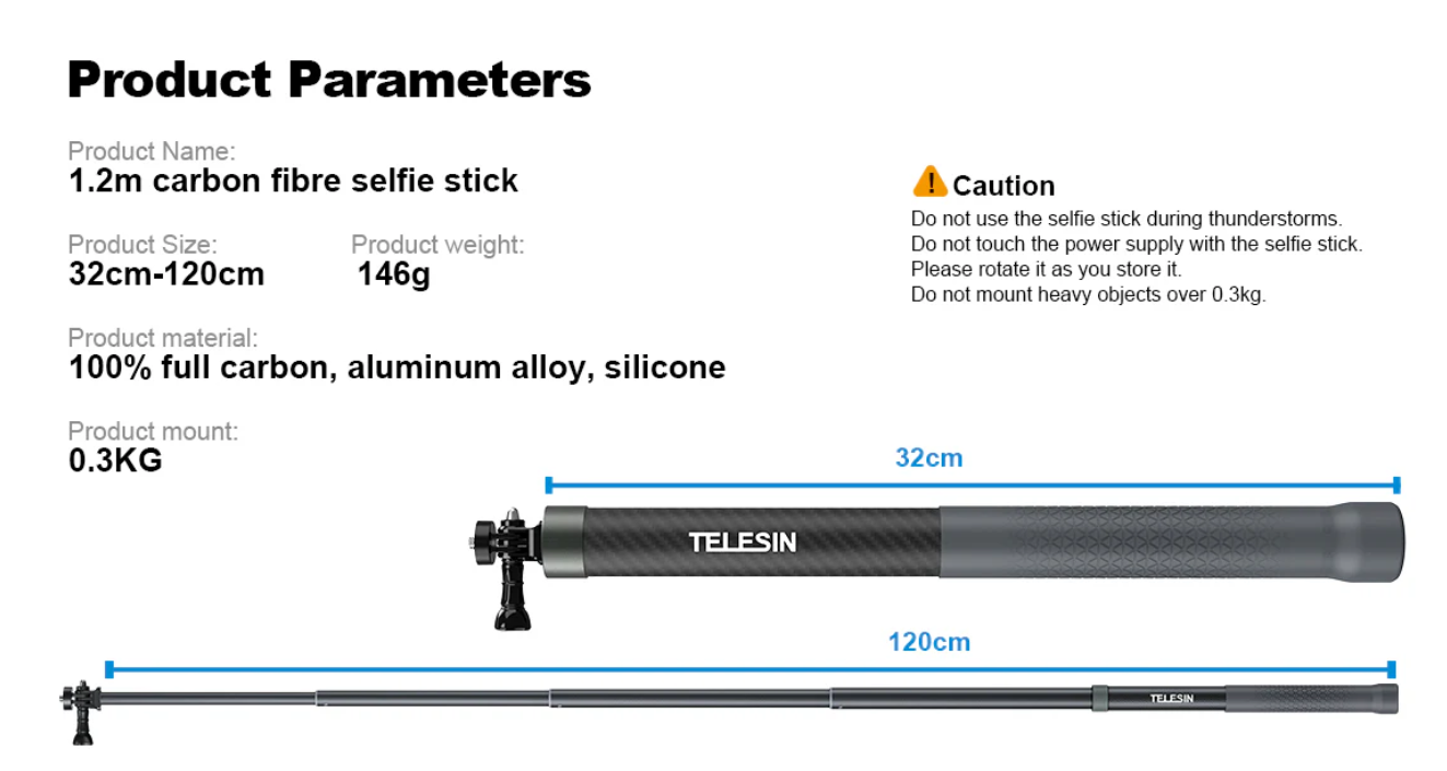Gậy 3M Telesin Carbon fiber tàng hình dành cho Insta360 , Actioncam, Gopro