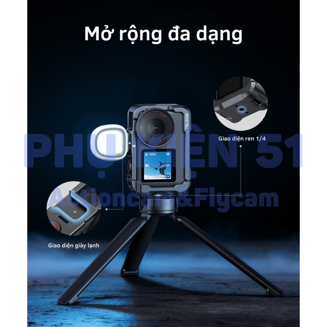 Lưu ý: Đế chuyển đổi được bán riêng. - Khả năng mở rộng linh hoạt với các cổng phụ kiện : Dễ dàng mở rộng thiết lập quay phim của bạn. Khung kim loại TELESIN dành cho Action 6 bao gồm cả giao diện ren 1/4 inch và giao diện đế gắn phụ kiện (cold shoe ), mang lại sự linh hoạt để gắn các phụ kiện bên ngoài như micro, đèn và các thiết bị khác. Cho dù bạn cần micro để có chất lượng âm thanh tốt hơn hay đèn chiếu sáng trong điều kiện thiếu sáng, khung này cho phép bạn tùy chỉnh thiết lập theo nhu cầu của mình.