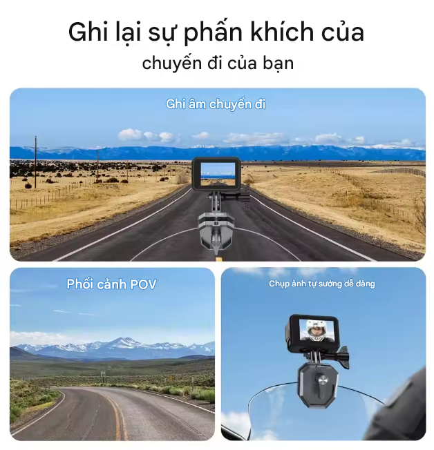 - Ghi lại những chuyến phiêu lưu của bạn: Kẹp kính chắn gió xe máy của chúng tôi cho phép bạn kết nối nhiều loại camera hành động có trên thị trường. Ghi lại những cảnh quay tuyệt đẹp từ nhiều góc độ khác nhau để ghi lại trải nghiệm đạp xe của bạn.